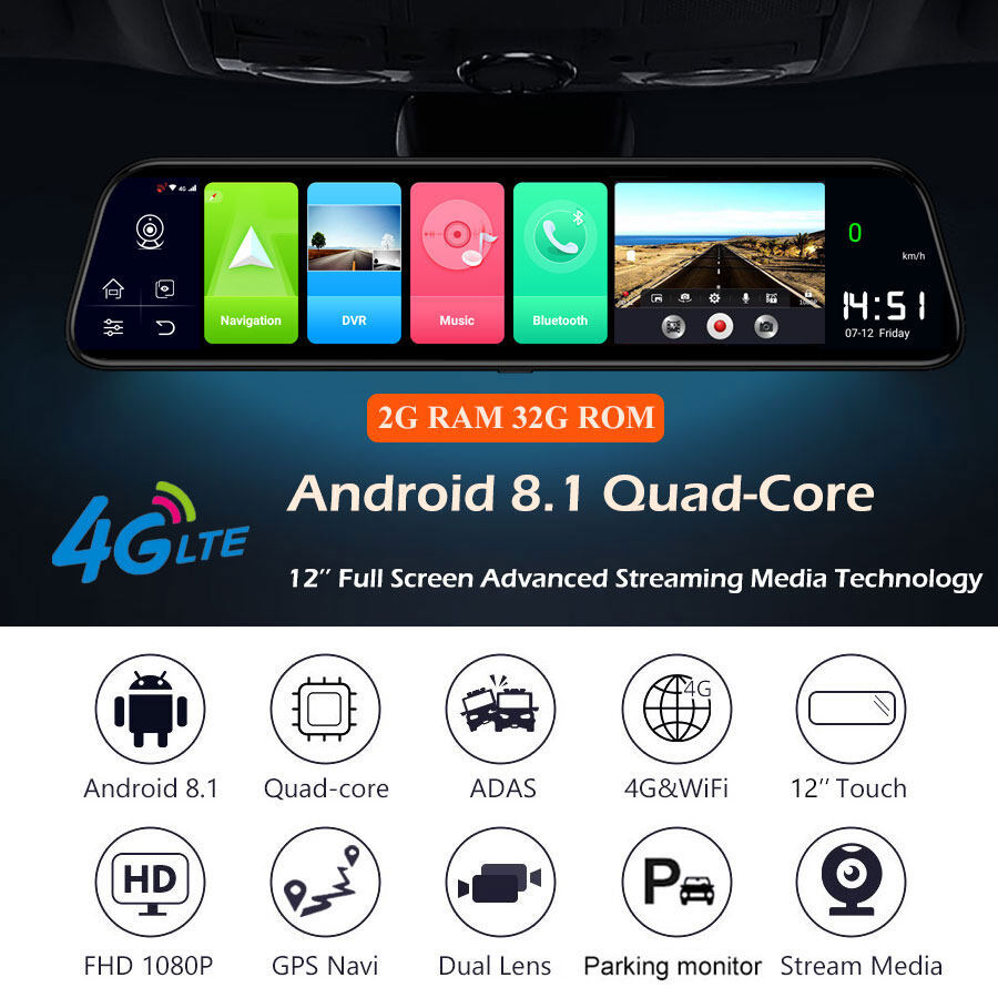 >> Android 8.1(Newest system)+ 2GB RAM/32GB ROM(enough memory to install apps, working smoothly) +ADAS Plus(LDWS/ FCWS/FVMA)+ GPS Navigation(Map free update, only EKLEVA brand support) +Full HD 1080P Recording+ 4G SIM &WIFI+Bluetooth+ Remote Monitor on "Car Keeper " APP+ 12" Full Screen