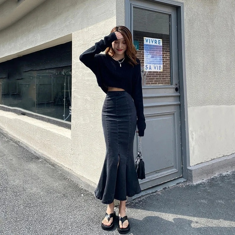 HolidayQueen New Spring and Summer Denim Skirt Female Design Sense High Waist A-line Ruffled Mid-length Bag Hip Fishtail Skirt Free Shipping HQP0126