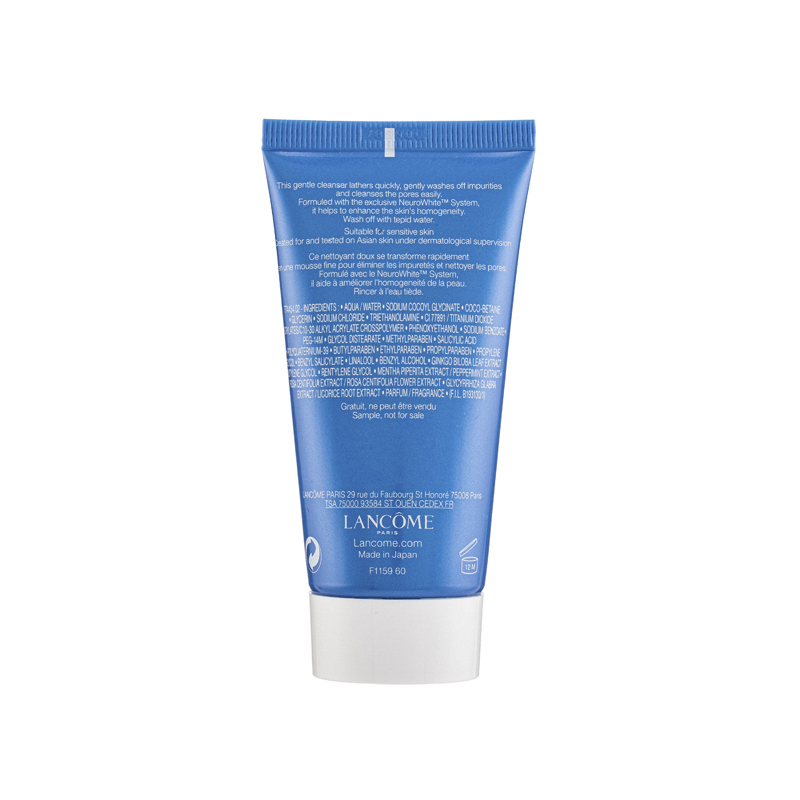Lancome Blanc Expert Ultimate Whitening Purifying Foam (50ml) Enriched with Mentha Piperita extract and Rosa Centifolia flower extract, it gently washes off the dirt and old dull skin cells for a dewy and translucent complexion.Product Features:•Skin brightening: this cleanser gently washes off dead skin cells, preventing accumulating of melanin causing dullness of skin.•Plant extract: nnriched with Mentha Piperita extract and Rosa Centifolia flower extract, this face wash nourishes and smoothes skin.•Gentle cleansing: the foam texture is soft and lathers quickly, clean the pores gently without causing any burden on skin.Ingredients :•Mentha Piperita extract: decomposing dead skin and keep pores clean •Rosa Centifolia flower extract: antioxidant and moisturizingHow to use:Apply an appropriate amount and lathers, gently massage on face, rinse with water.