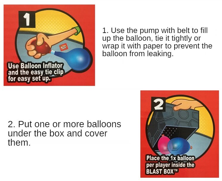 One set includes : 1 blast box , 1 hammer, 1 balloon Inflator , 30 pins , 1 spinner, 100 balloons, 20 easy tie clips