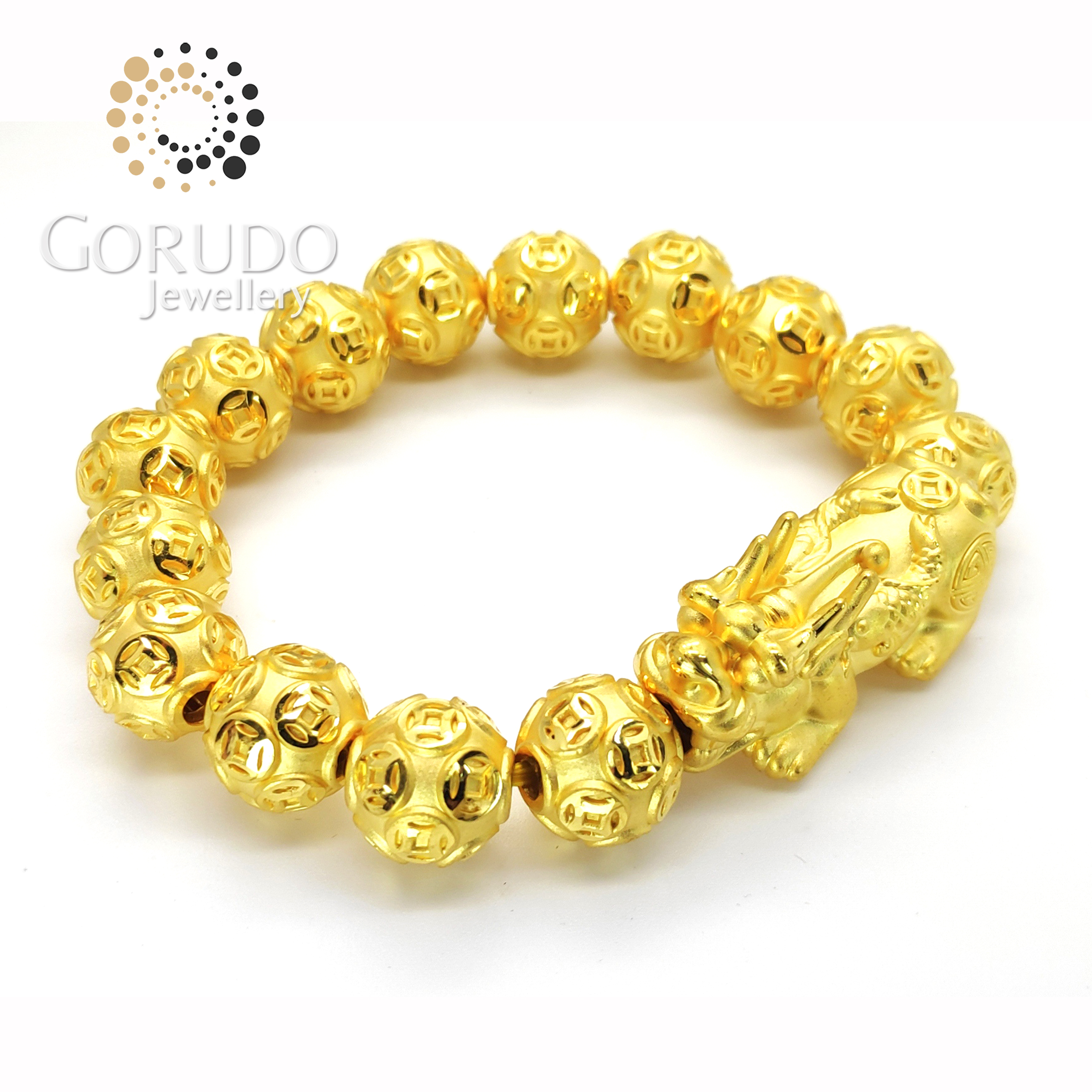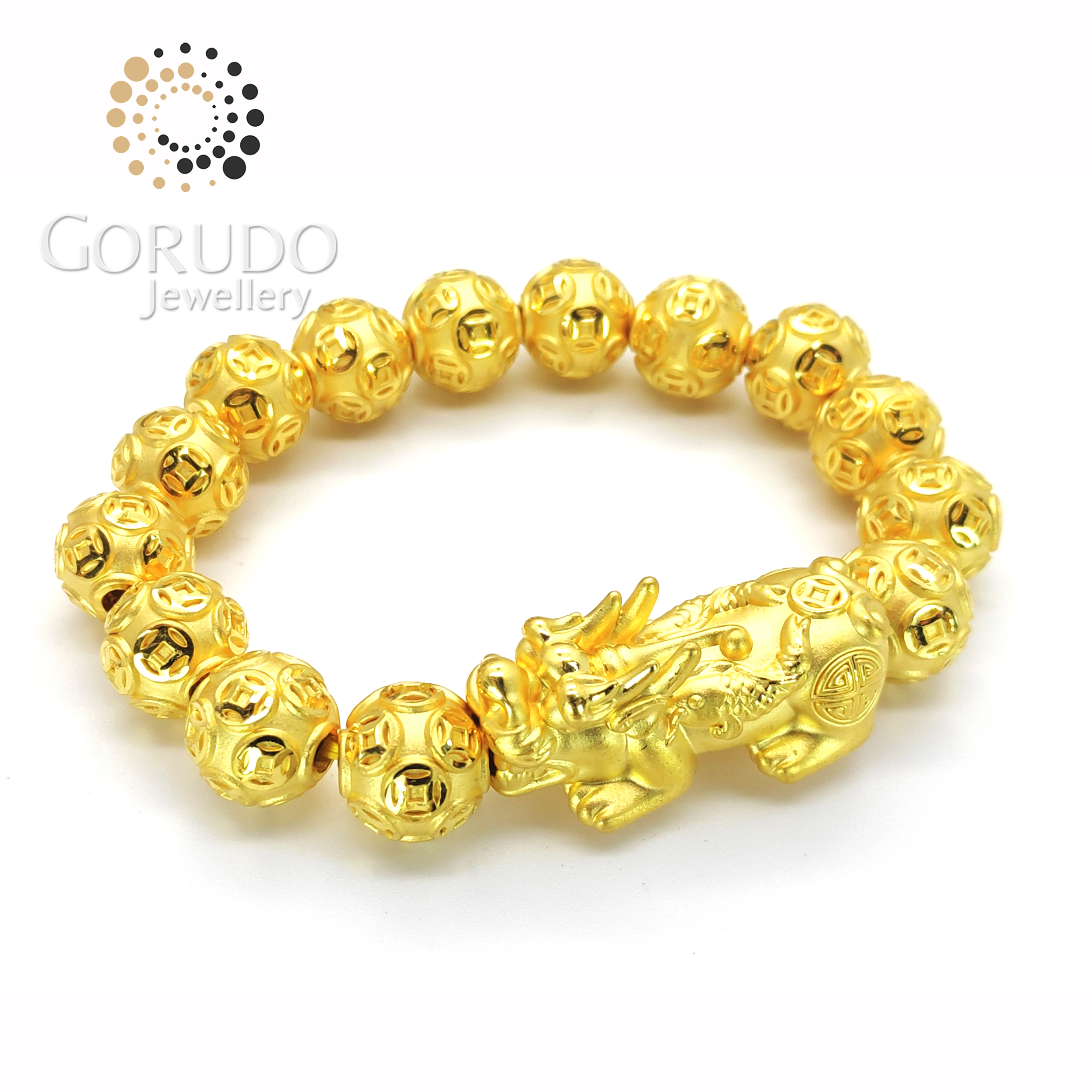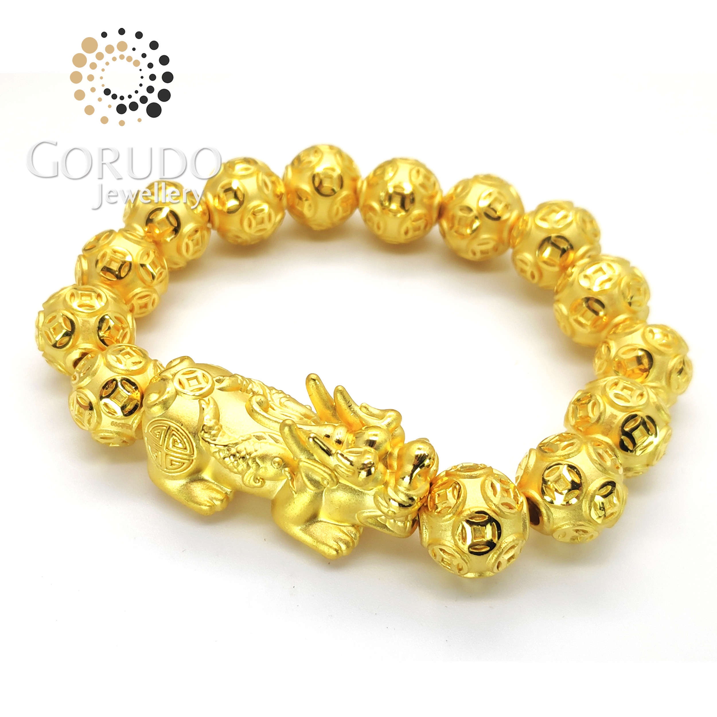 - 1 x Gorudo Jewellery Pure Gold 999 双鱼 Pixiu + 15 Auspicious Gold Coin Ball Charm Bracelet