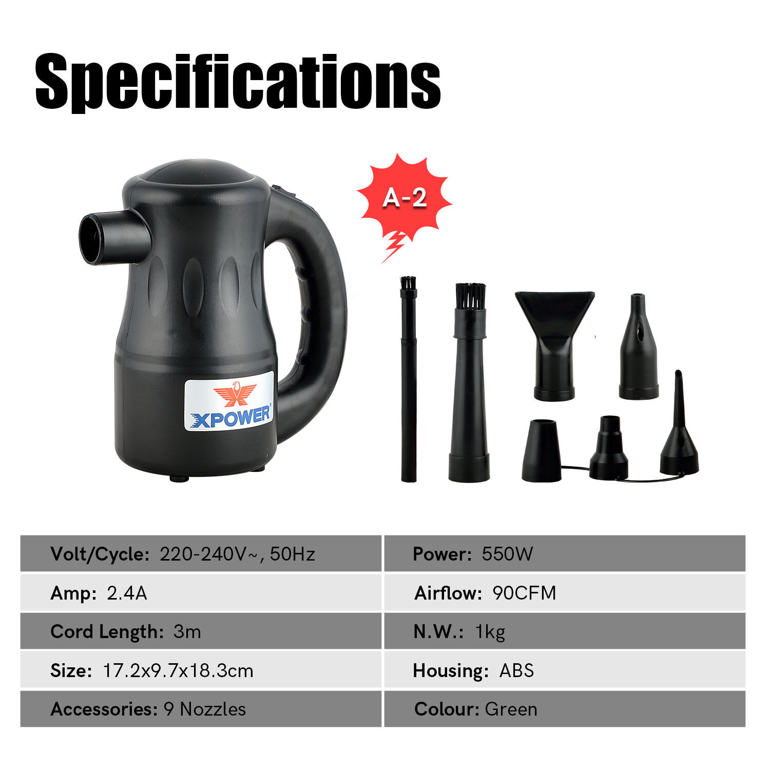 • Multi-Use: an alternative to canned air, the A-2 is more effectively used in computers, laptops, car interiors, cameras, medical equipment, model vehicles, and blinds .Many more other applications with 9 easy-to-use nozzle attachments