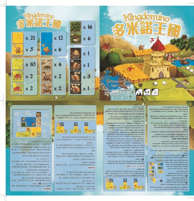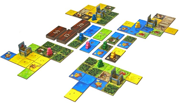 Players take on the role of Lords seeking new lands to expand their kingdom. As with 'Dominoes', these new lands must match the landscape tiles that have already been played. You need to create large areas of the same landscape type. But these will only score points if there is at least one crown on a tile. Points for each landscape type are calculated at the end of the game by multiplying these two together: so the number of squares times the number of crowns. Before this however, you’ll need to pay attention to your choice of tile, which decides the order of play for the following round. Taking a good tile now means you’ll play later next time. Each round presents the players with new important decisions as to which tile they should take.