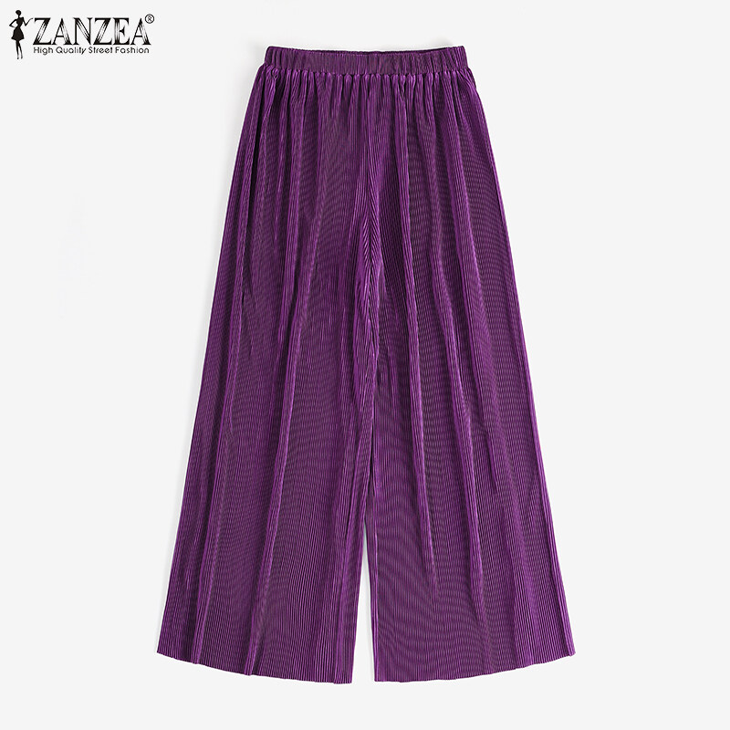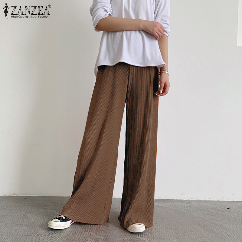 ZANZEA Korean Style Womens Elastic Waist Casual Long Pants Wide Leg Pleated Trousers