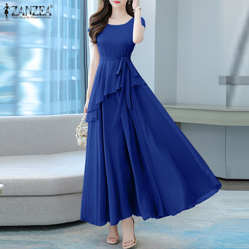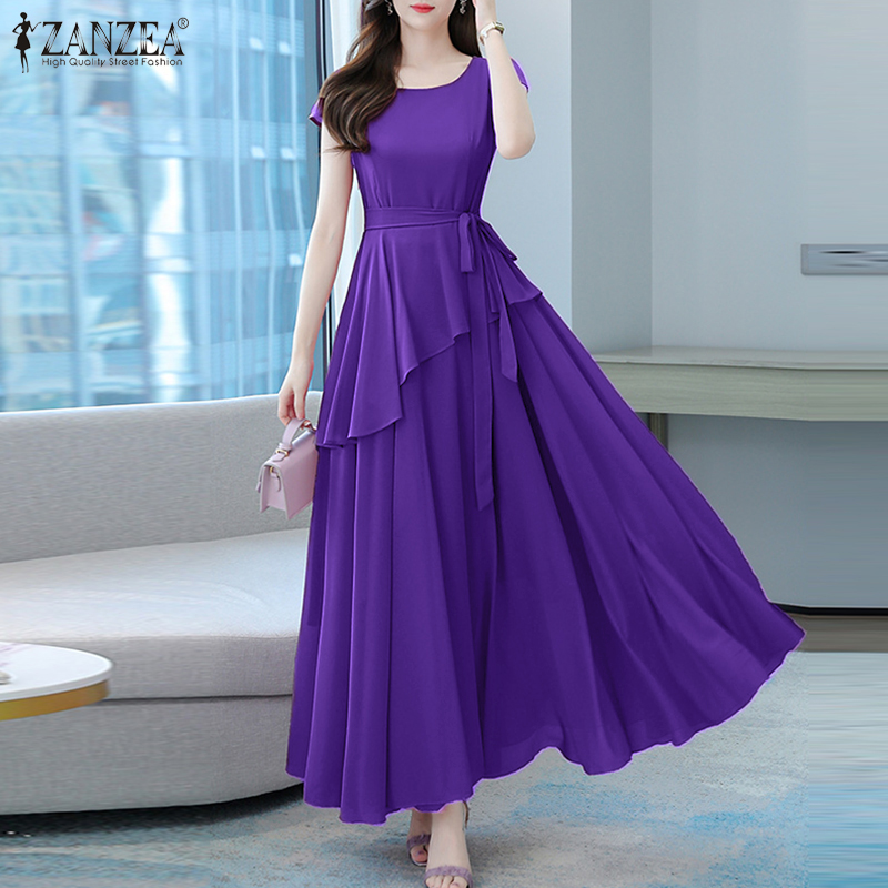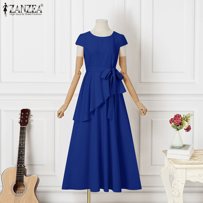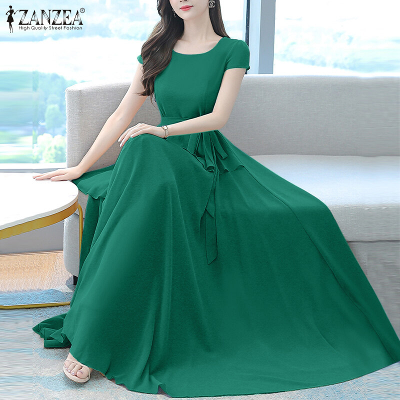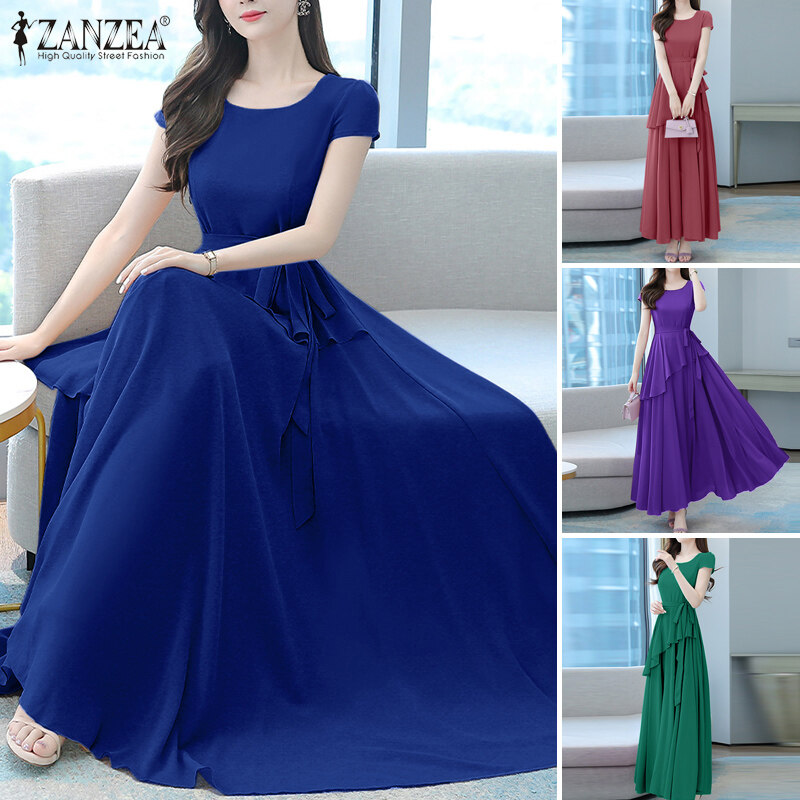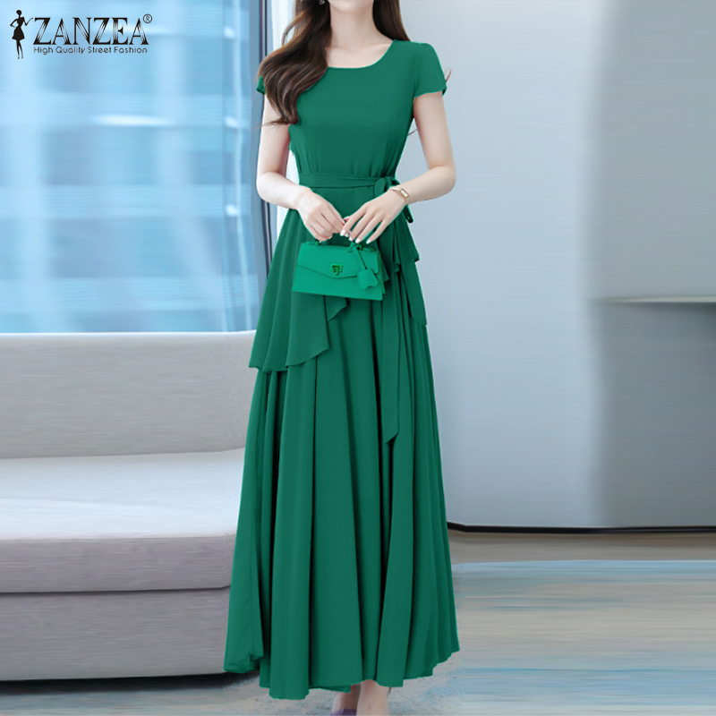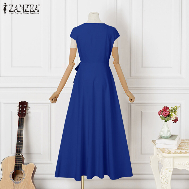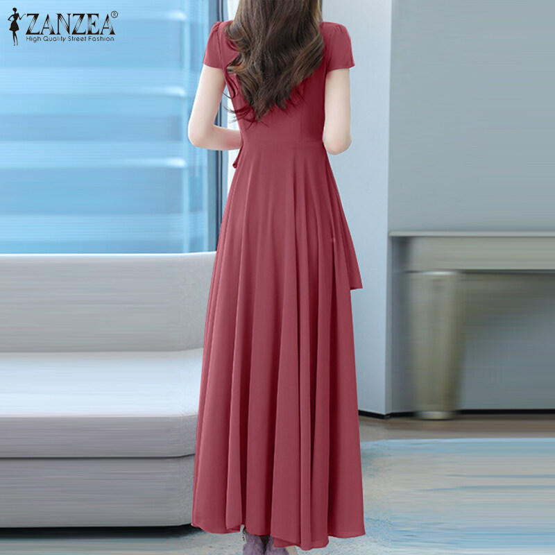 ZANZEA Korean Style Womens Short Sleeve Plain Evening Ballet Party Elegant Swing Maxi Dress