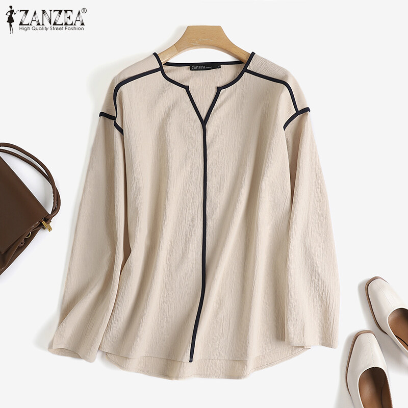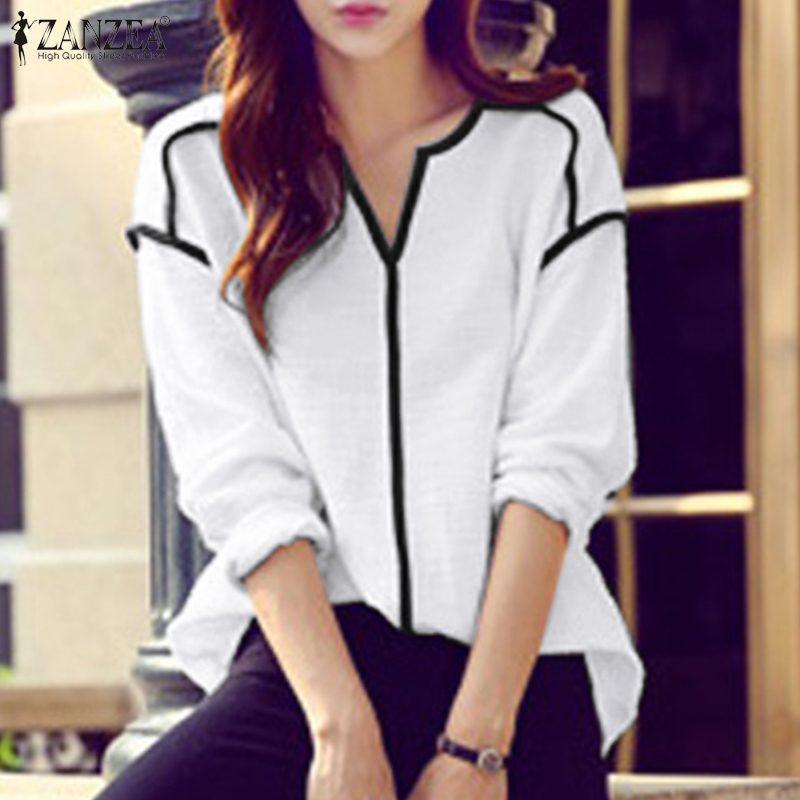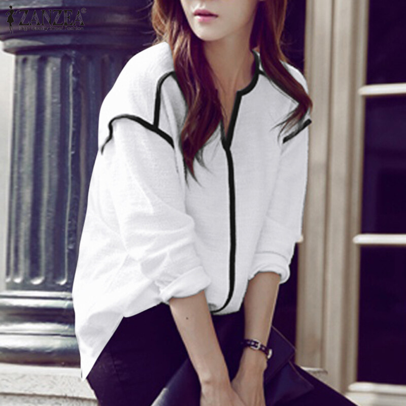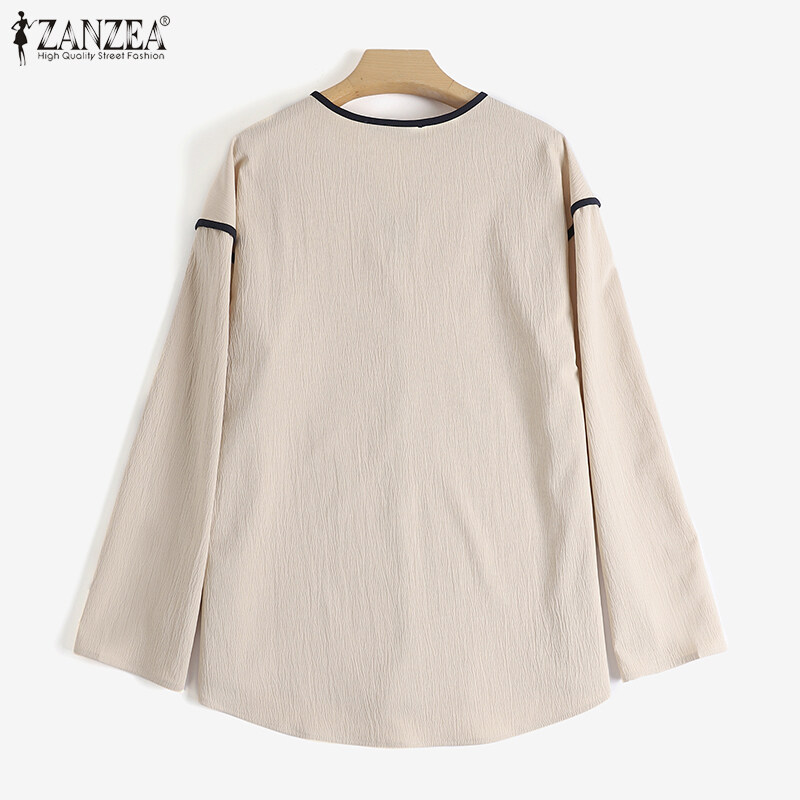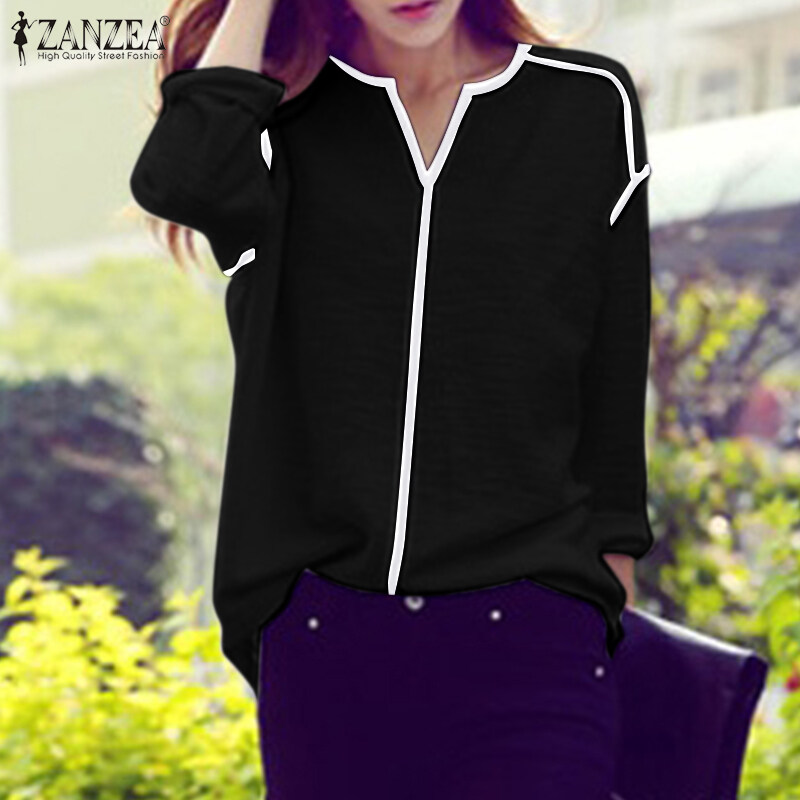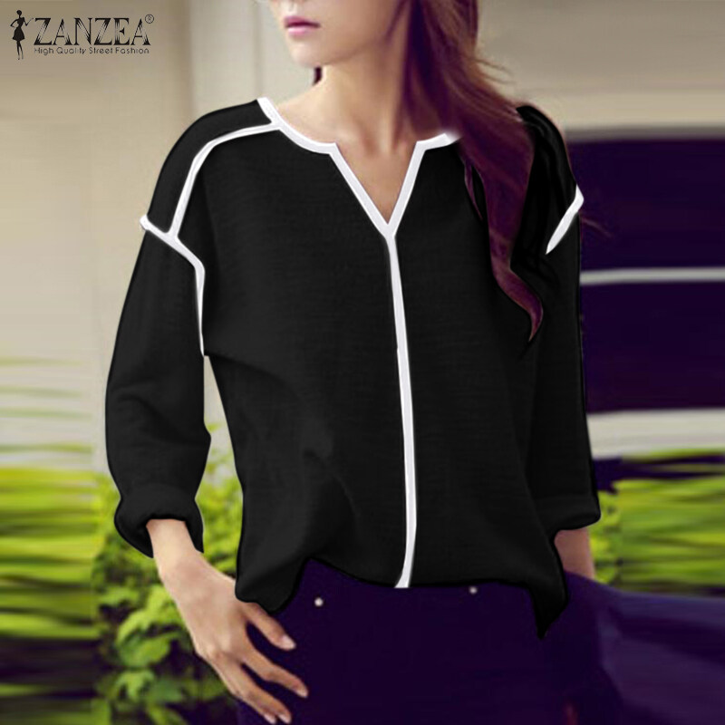 ZANZEA Womens Long Sleeve Contrast Color T Shirts Casual Baggy V Neck Jumper Tops Blouse