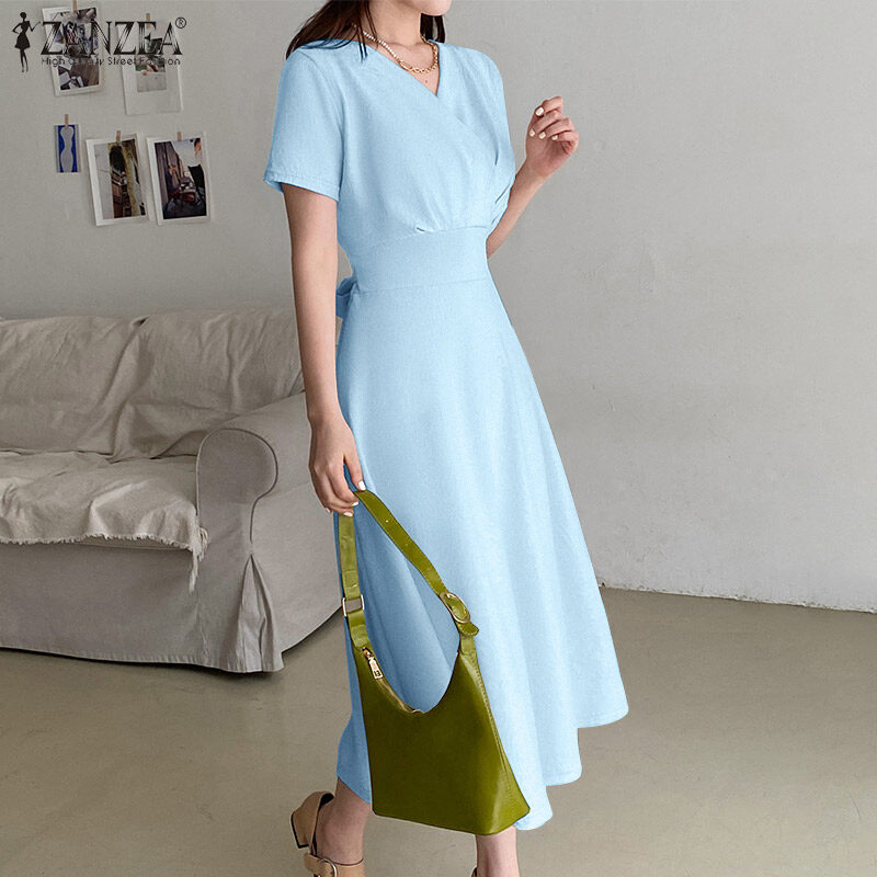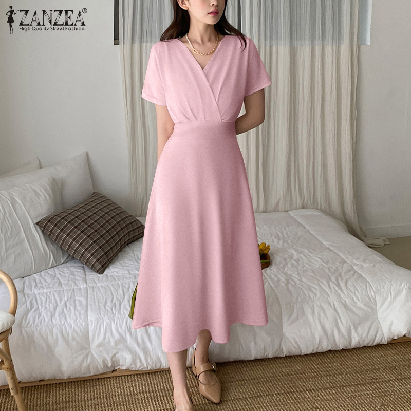 ZANZEA Korean Style Women Elegant Plain V Neck Tunic Dress Short Sleeve OL Midi Dresses #10