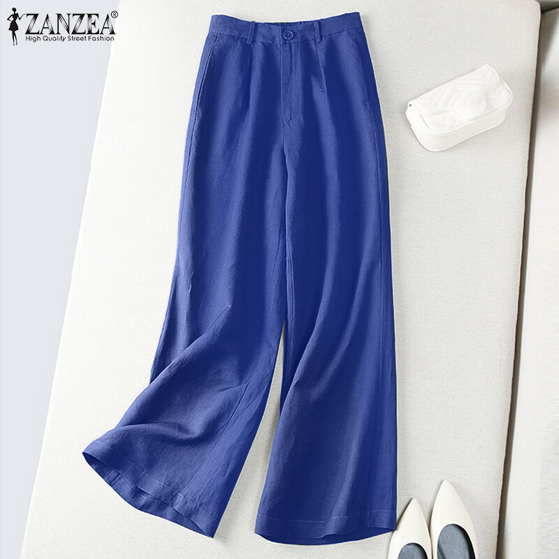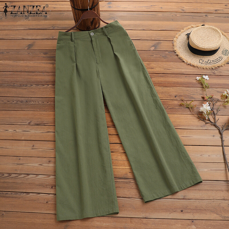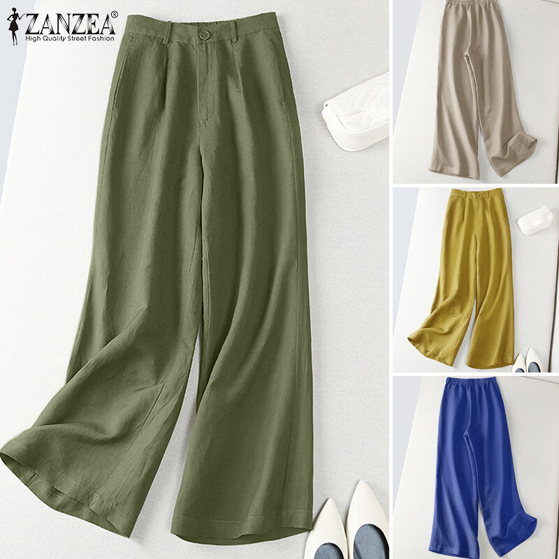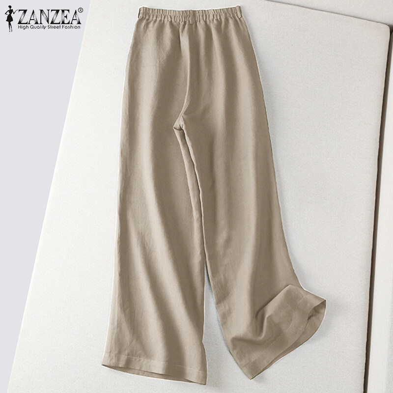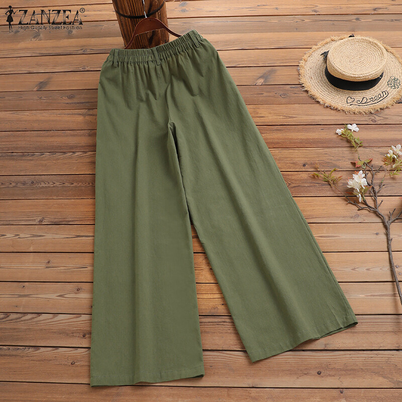 ZANZEA Women Wide Leg Solid Long Pants Elastic Waist Casual Office Cargo Chino Trousers #2