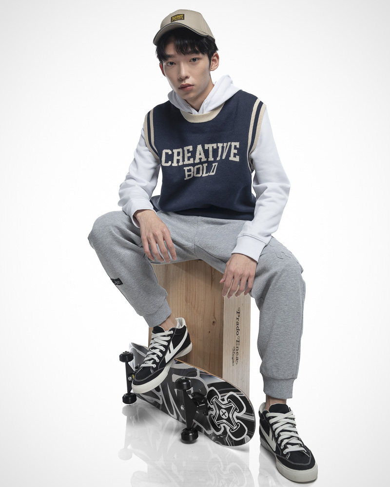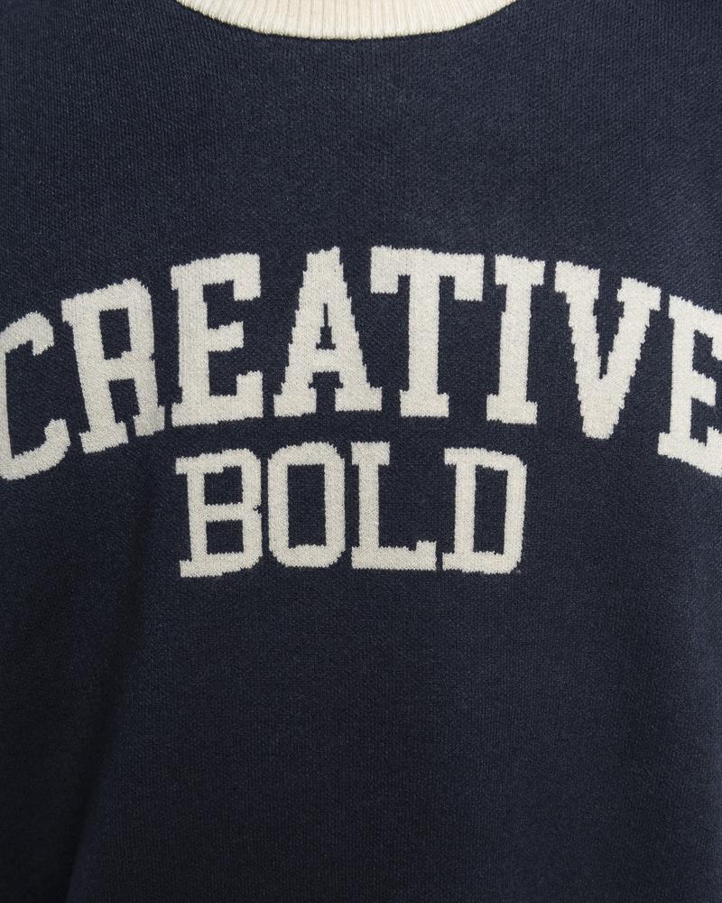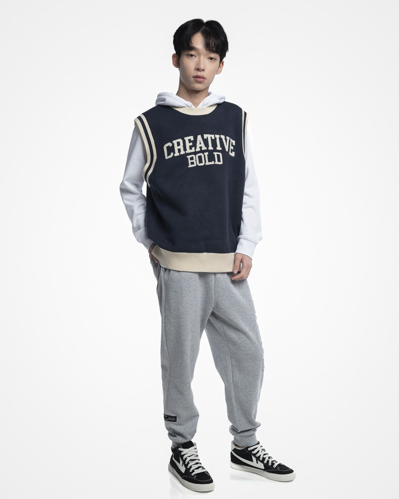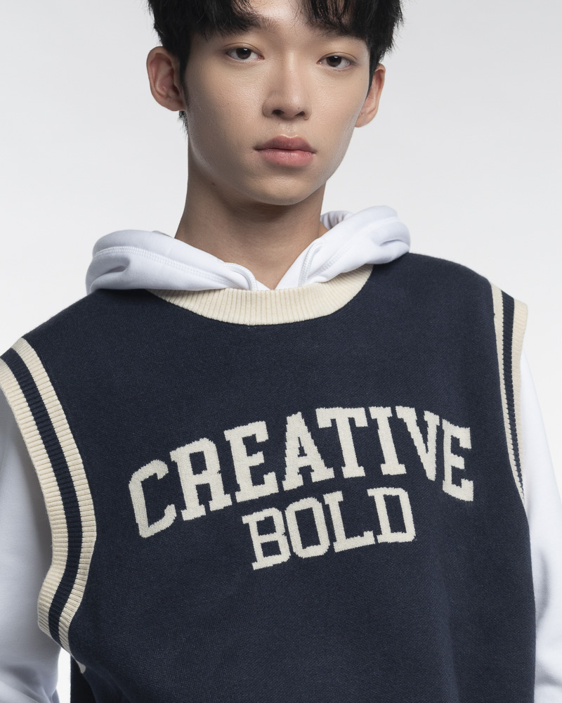 Yishion Men Knitted Round Neck Varsity Vest With Asymmetrical Contrast Coloured Neckline and CREATIVE Slogan (Dk. Blue)