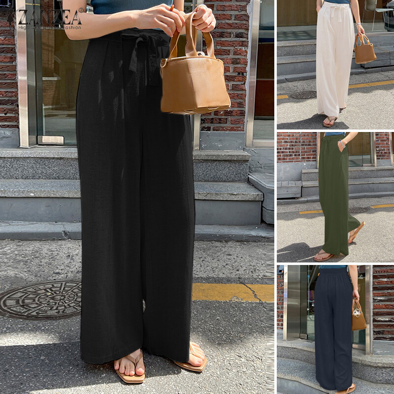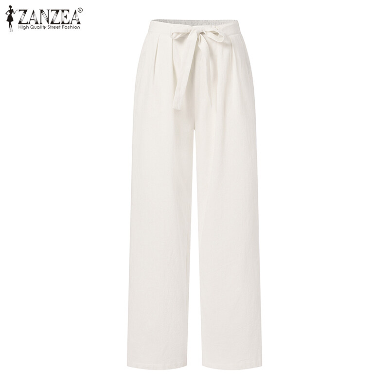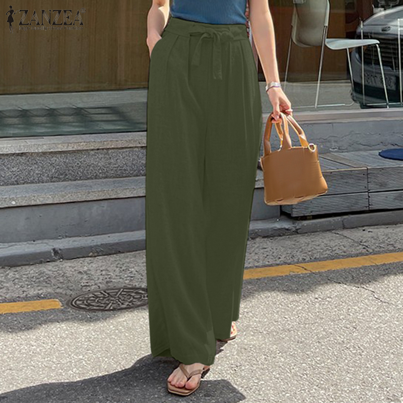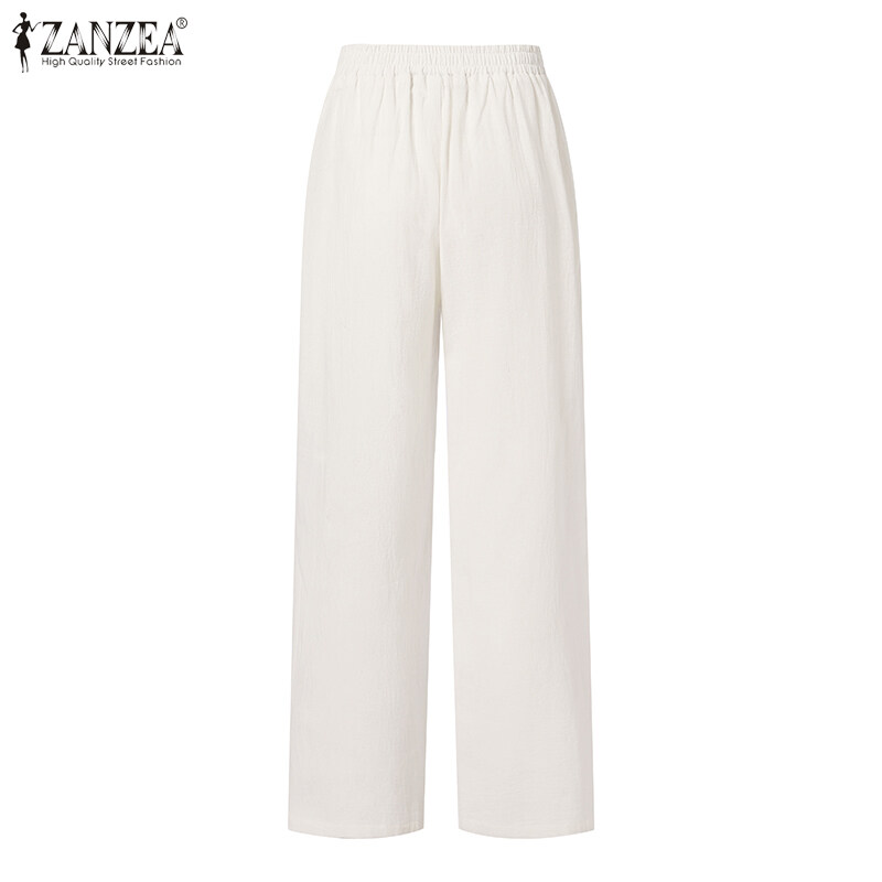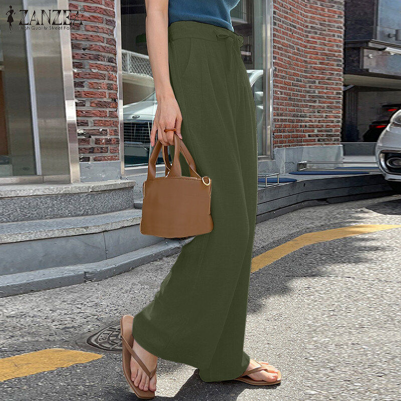 ZANZEA Korean Style Women Cotton Elastic Waist Solid Straight Trousers Solid Loose Lace-Up Pleating Pants #10