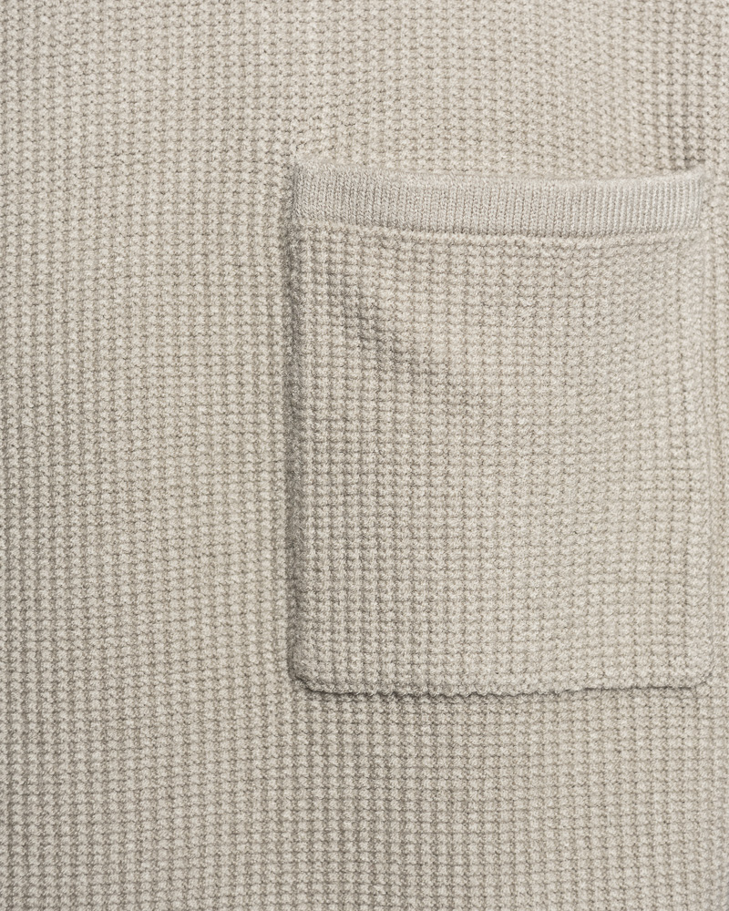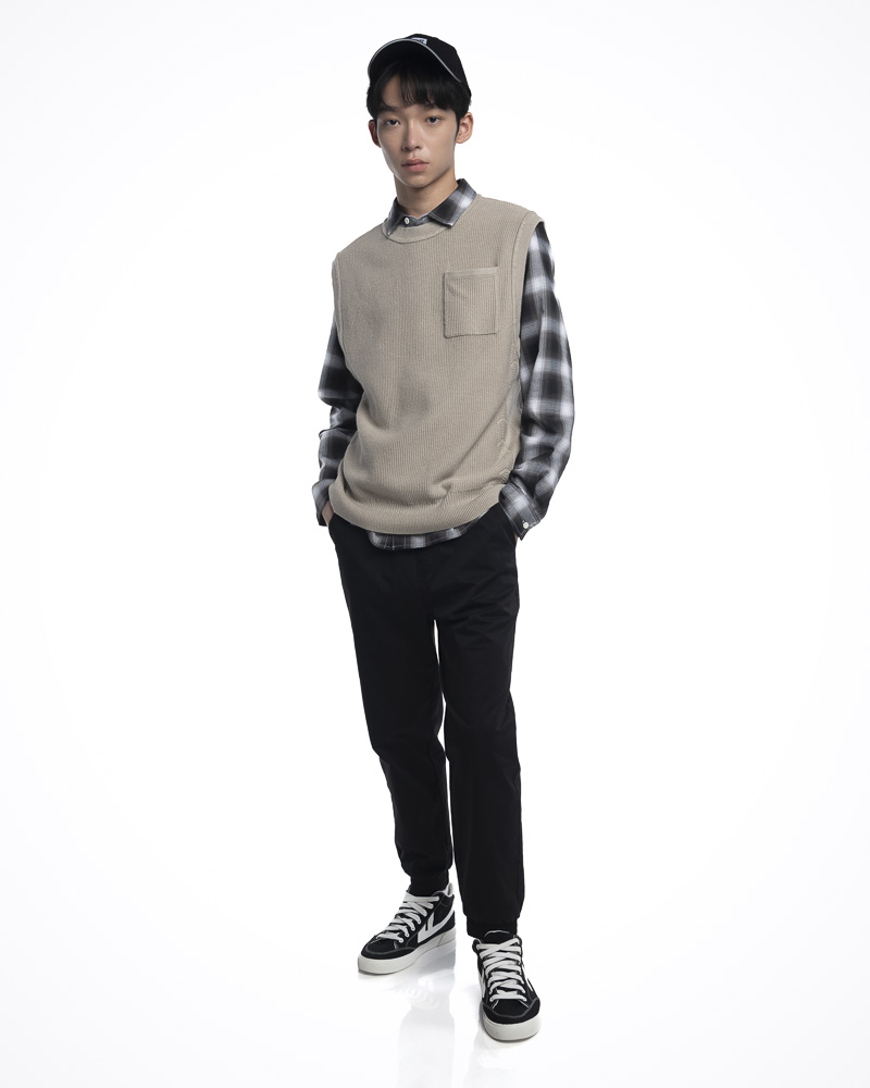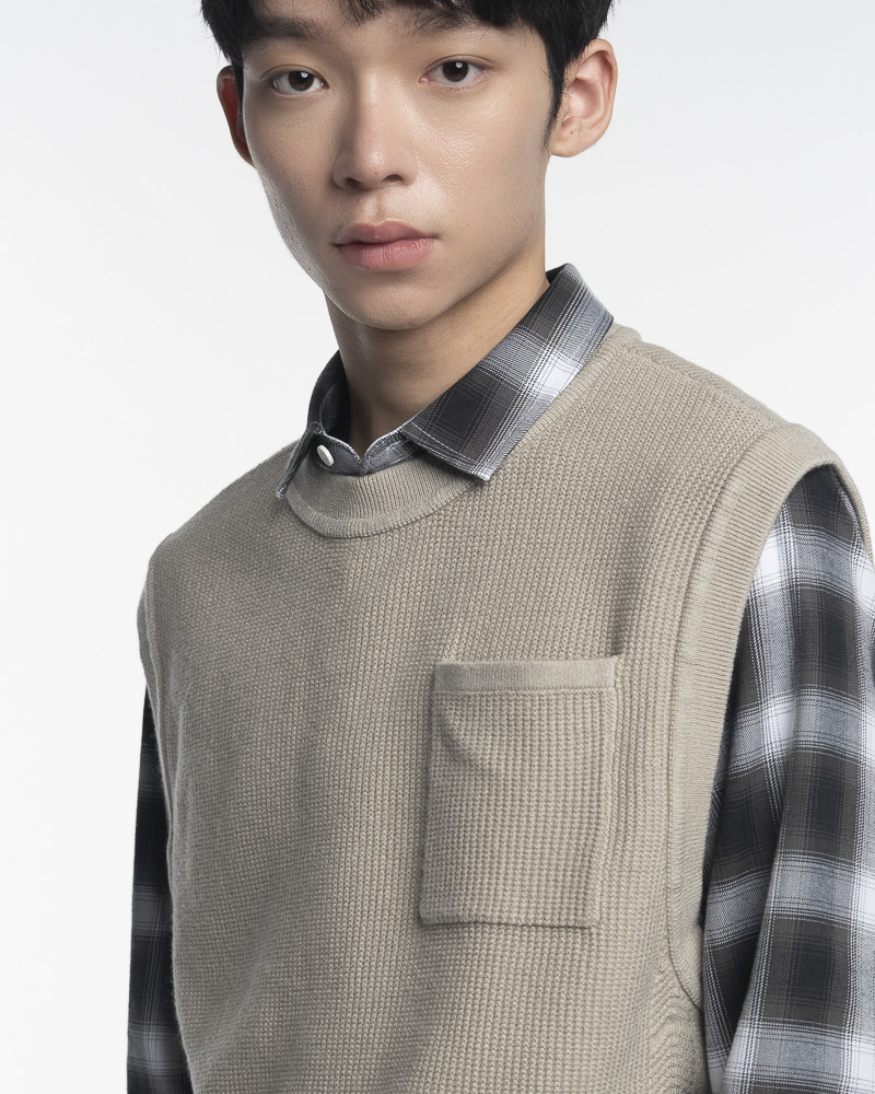 Yishion Men Knitted Round Neck Vest with Chest Pocket and Ribbed Hem (Khaki Beige)