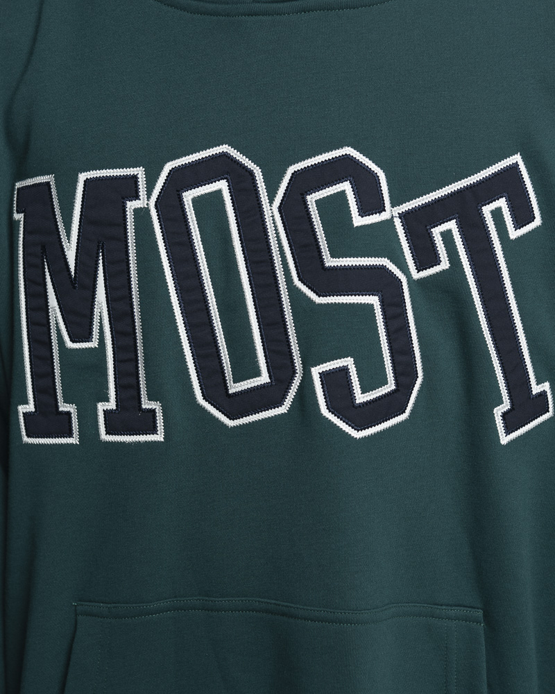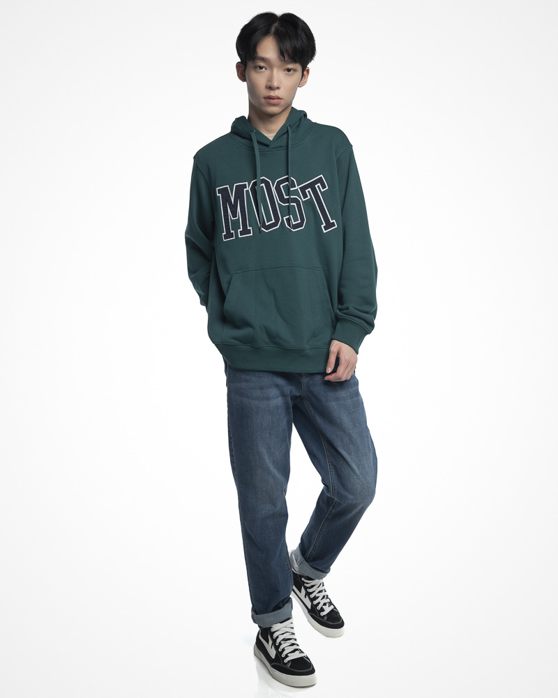 Yishion Men Solid Coloured Pullover Hoodie with Kangaroo Pockets and MOST Slogan Patch (Dk. Green)
