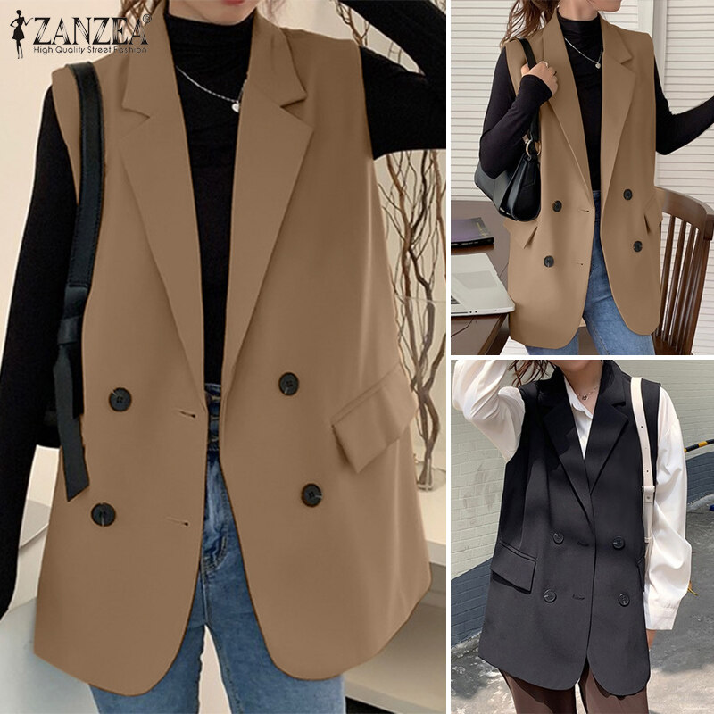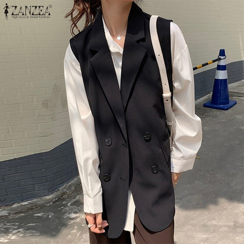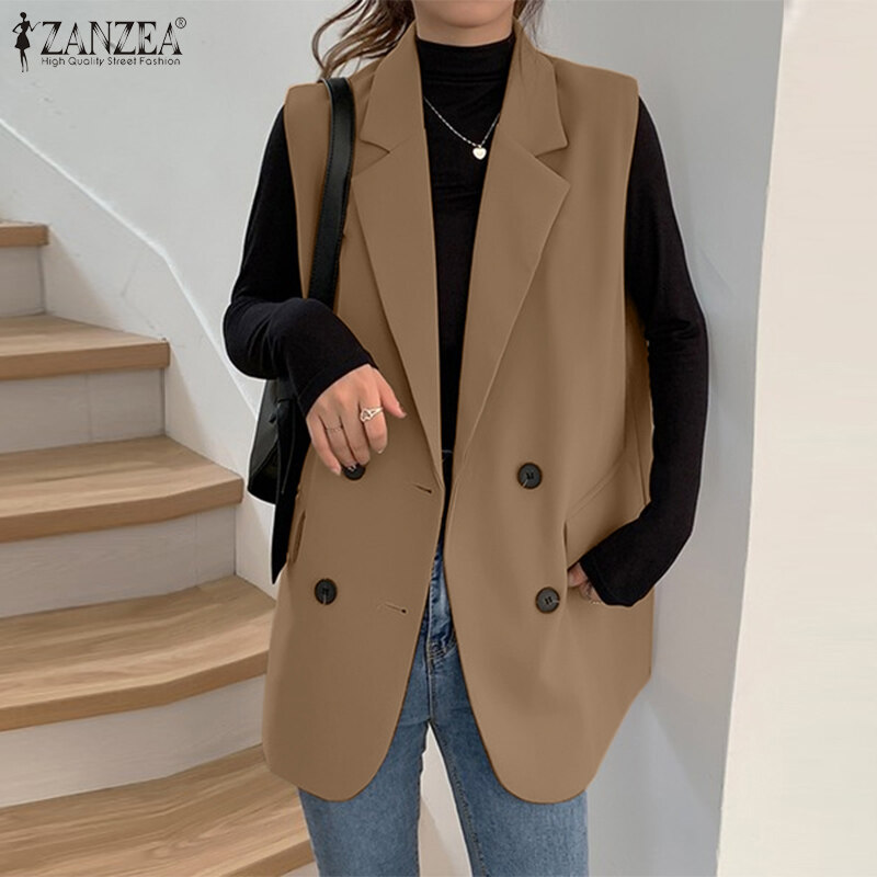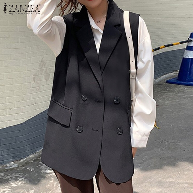 ZANZEA Korean Style Women Commute Turn-Down-Collar Sleeveless Blazer Double-Breasted Solid Vests #10