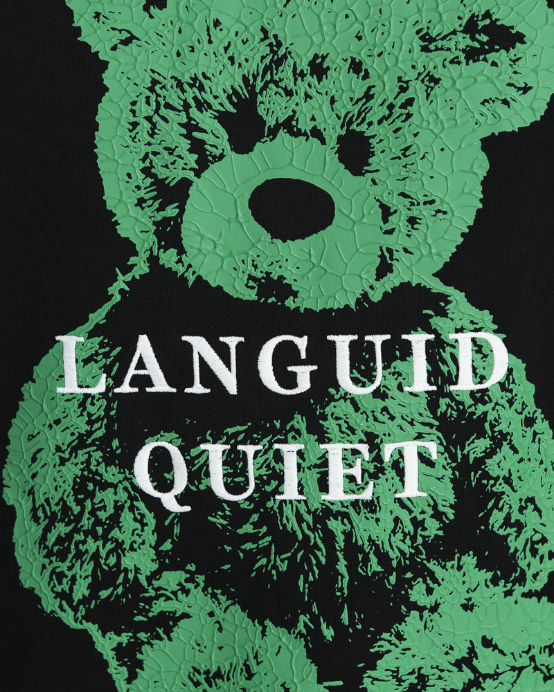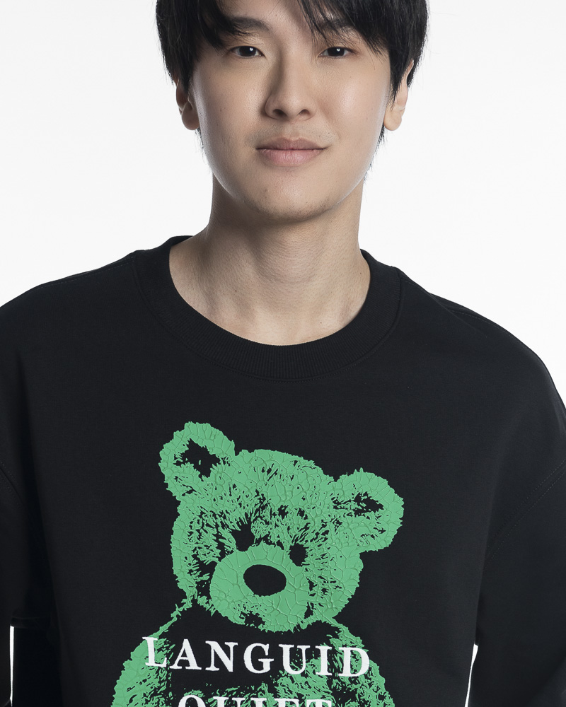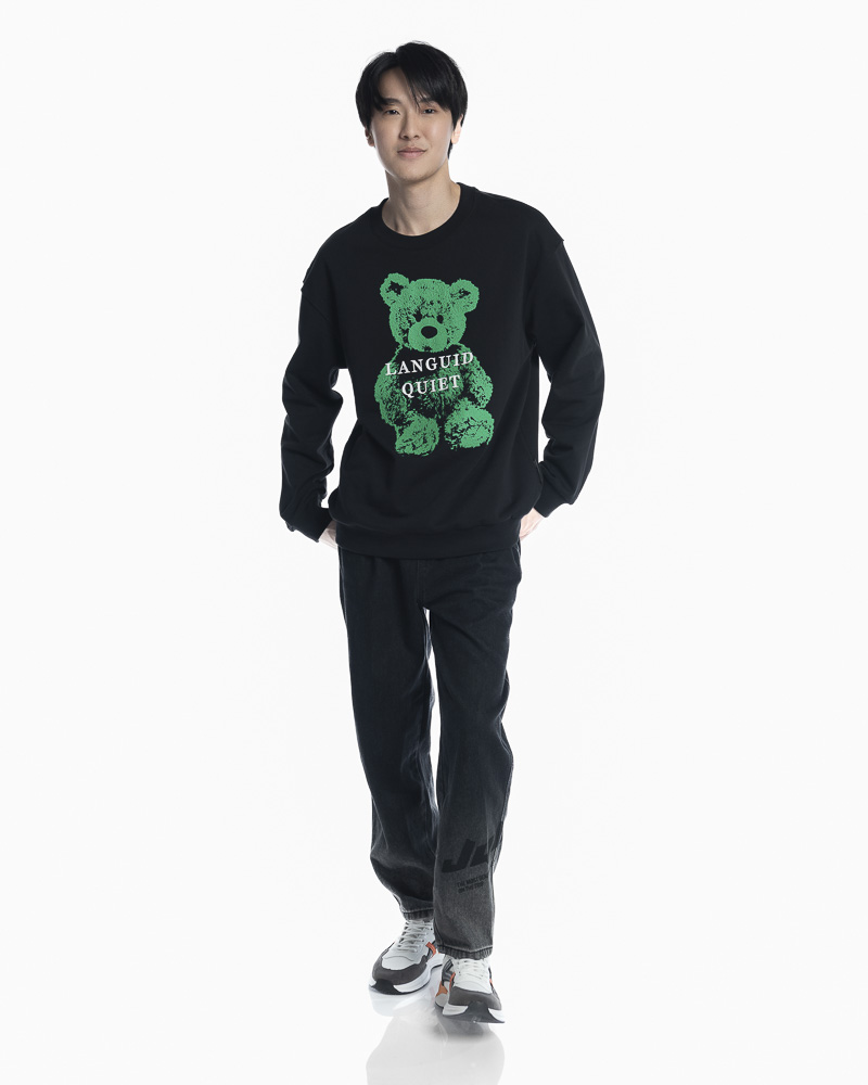 Yishion Men Solid Colour Long Sleeve Sweatshirt with Green Rubber Bear Patch Embroidery and Slogan (Black)