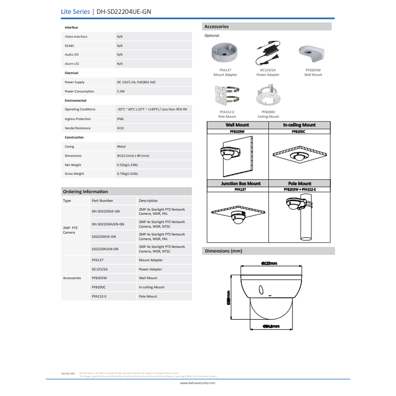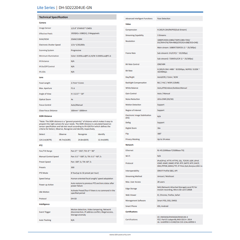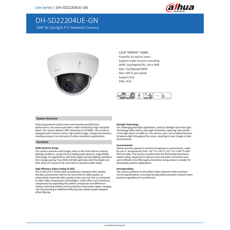 Dahua PTZ 4x Optical Zoom Mini Pan Tilt Zoom 2MP Starlight Vandal-Proof IP66 PoE Network CCTV IP Camera •DH-SD22204UE-GN