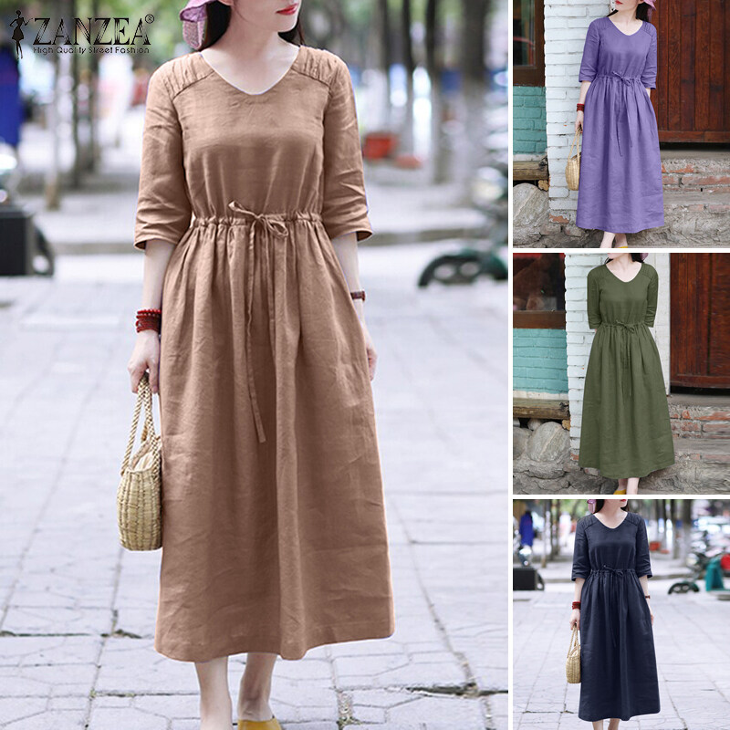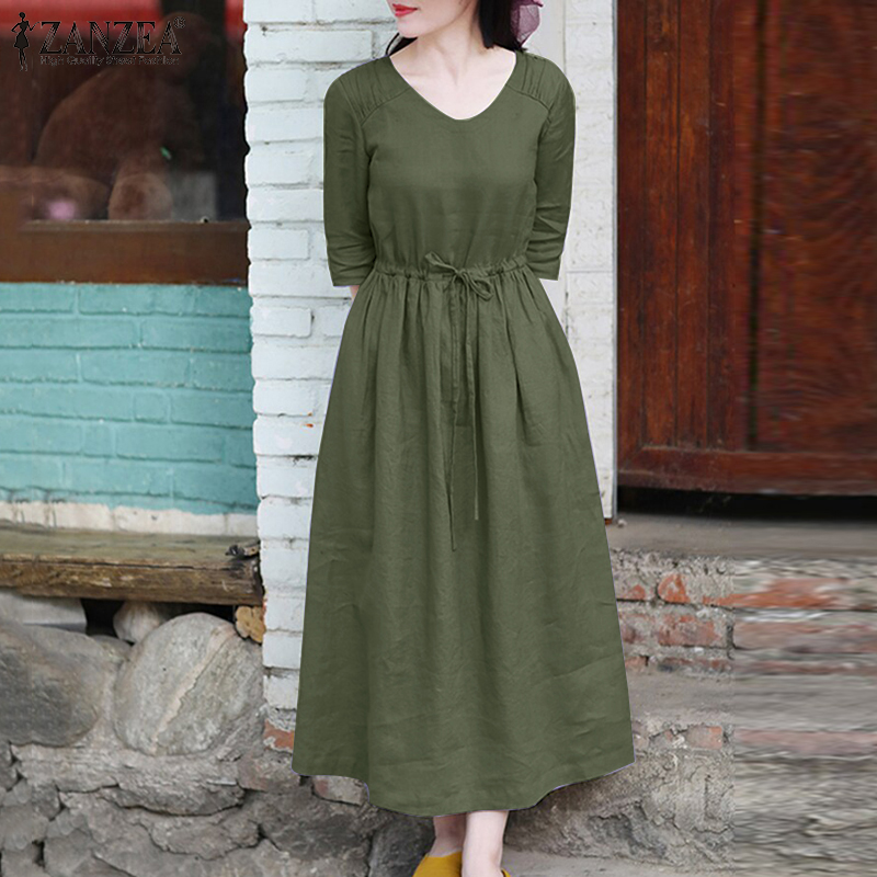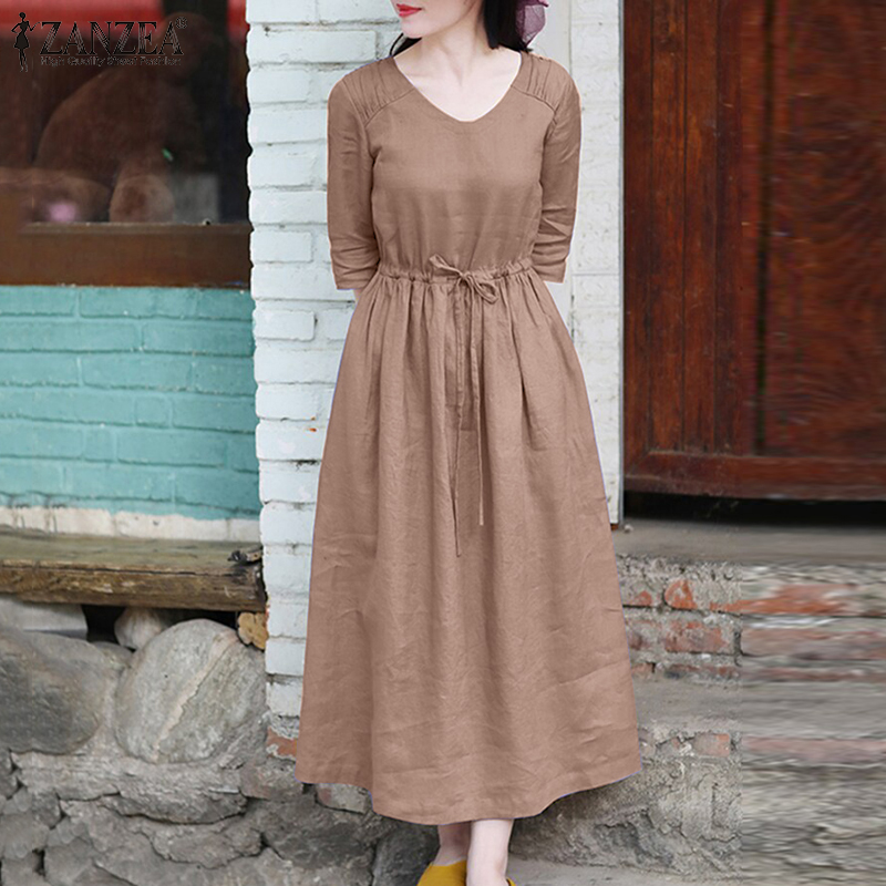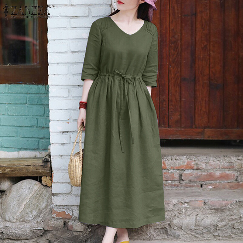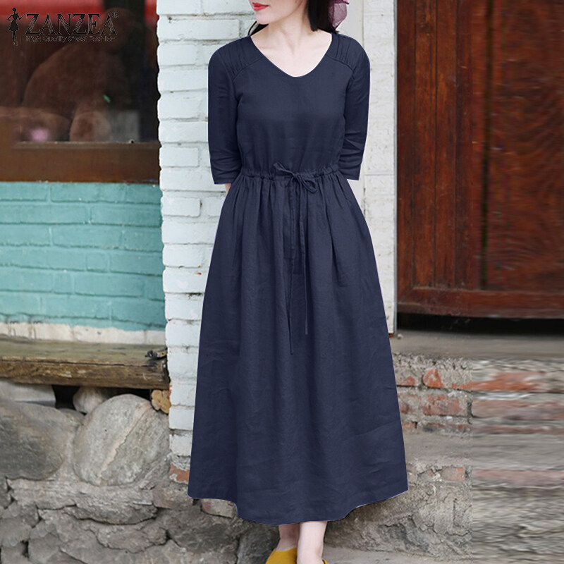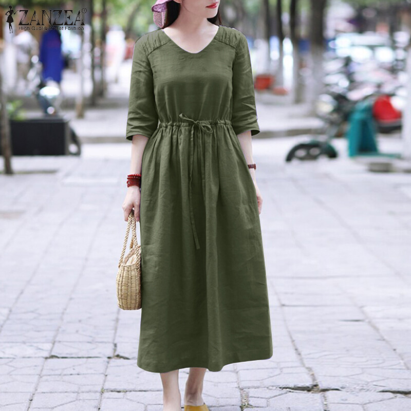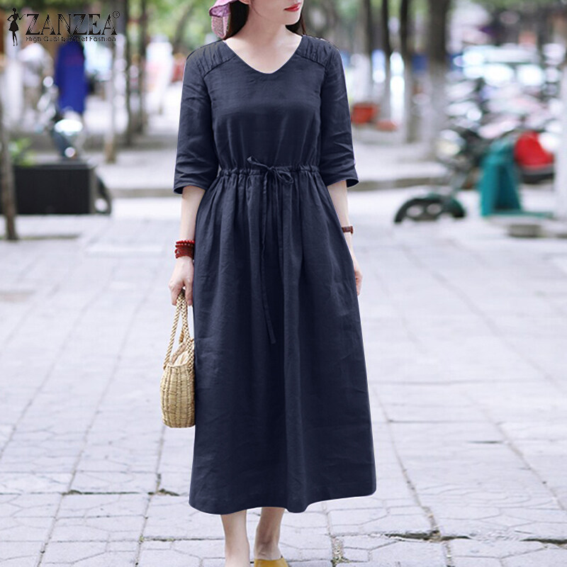 ZANZEA Womens Simple Vintage V-Neck Tie Waist Midi Dress Casual Loose Plain Sundress #8