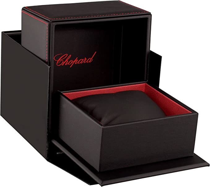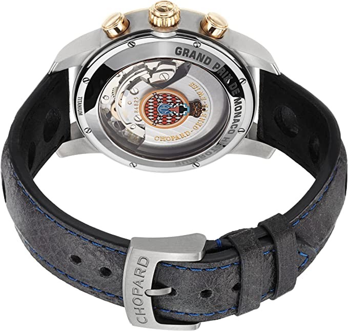 Grey (racing stripes) dial enhanced by luminous rose gold hands. Grey titanium case with grey (calfskin) leather (openworked) strap. Automatic movement. 50 m/165 ft water resistant. Fixed bezel. Scratch-resistant sapphire crystal. Skeleton caseback. Pin buckle. Screw-down crown. Case dimensions 42 mm x 14.7 mm. Strap 20 mm x length. Chopard 168992-9001 Monaco Grand Prix 2012 Edition watch.