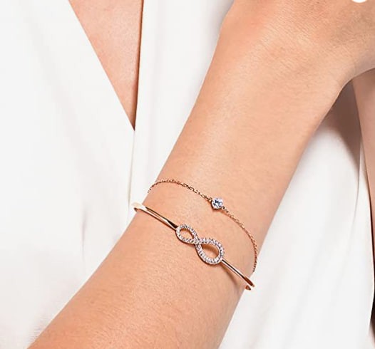 Glamourous: This bracelet combines the precision and quality of gleaming Swarovski crystals with delightful details such as a curved rose gold plated infinity symbol for an elegant design